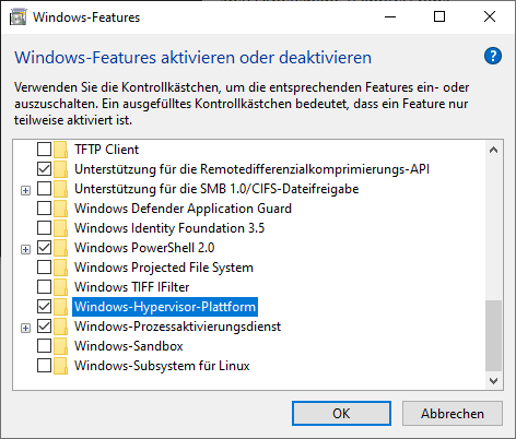Die Windows Hypervisor Plattform wird unter den Windows-Features aktivieren oder deaktivieren aktiviert oder deaktiviert.[1][2][3][4]