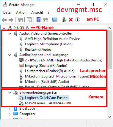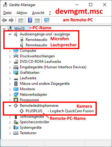 Am Remote-PC sind die Audio und Bildverarbeitungsgeräte im Gerätemanger zu finden. Aufruf mit: