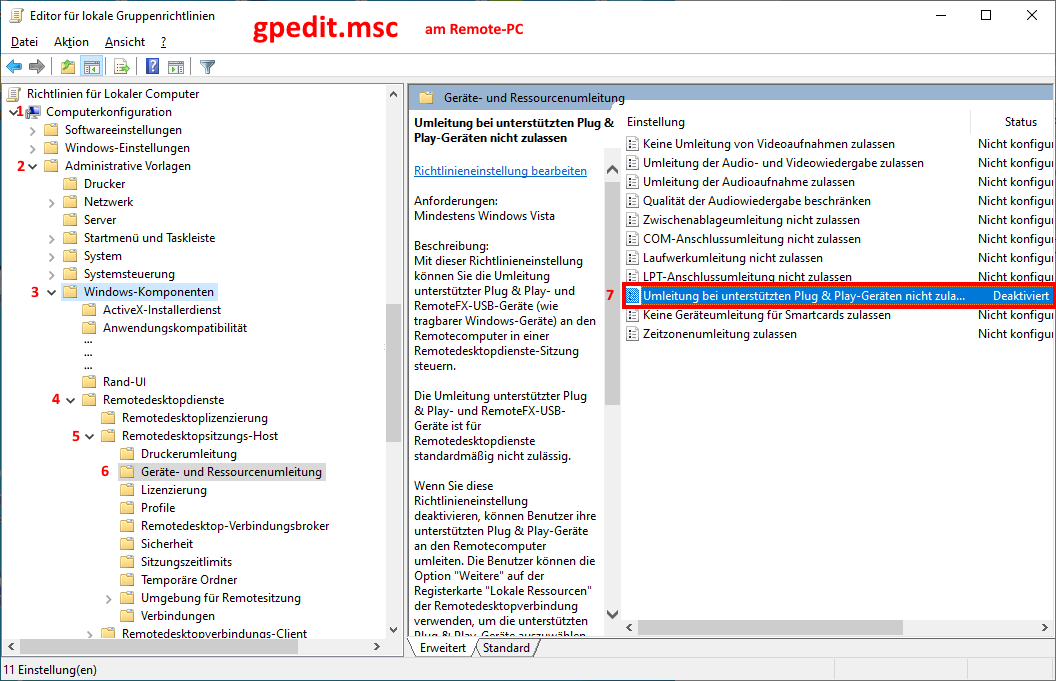 Standardmäßig werden Plug & Play- und RemoteFX-USB-Geräte nicht umgeleitet. Durch das Deaktivieren der Sperre wird diese aufgehoben. Das ist in der Gruppenrichtline festgelegt.
